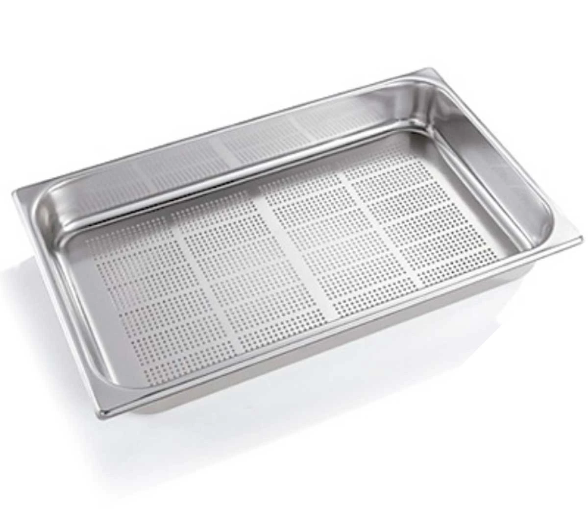 La Cubeta GN 1/1 de Dobra está fabricada en acero inoxidable de superficie perforada y sus medidas son 53 x 32,5 cm.