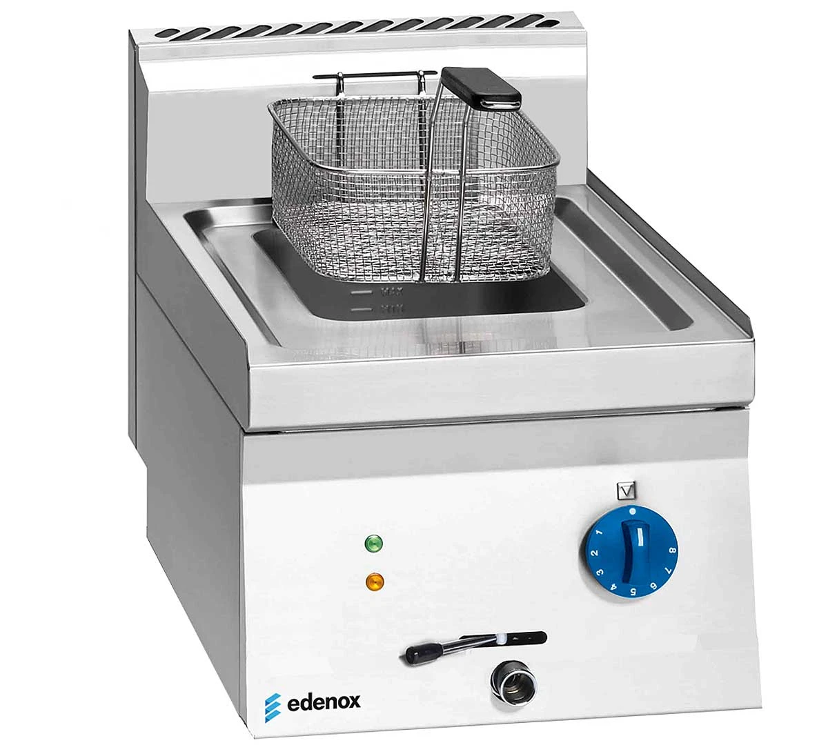 Freidora Snack 650 SFE de Edenox eléctrica y fabricada en acero inoxidable con capacidad de 8 litros de aceite. Equipada con resistencias elevables, piloto de luz-testigo y grifo de descarga.