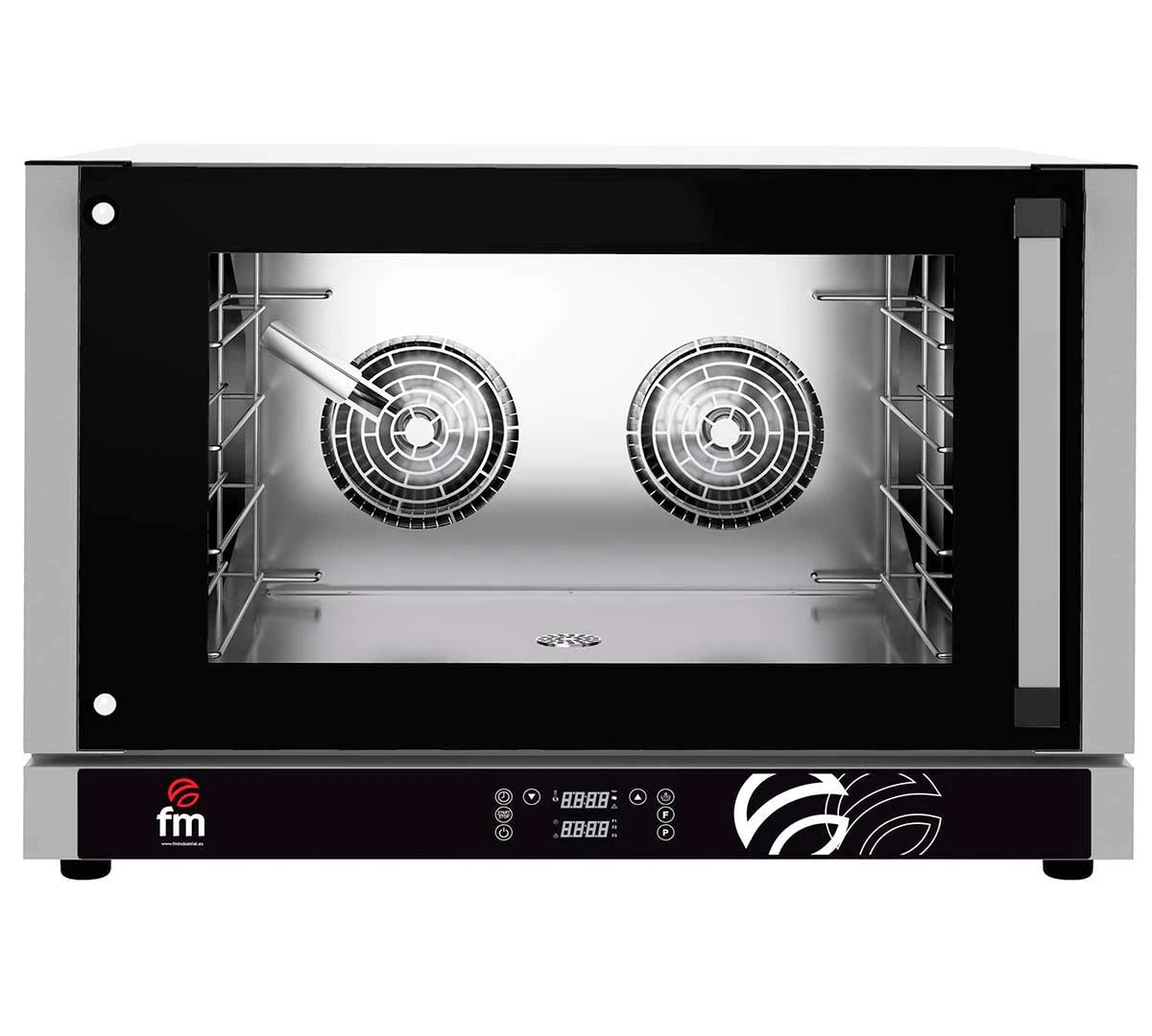 El Horno Eléctrico de Convección RXD 604 Plus de FM incorpora humidificador regulable de 0 a 100%. Puerta de apertura lateral. Tiene una capacidad para 4 bandejas 60 x 40 cm o GN 1/1.