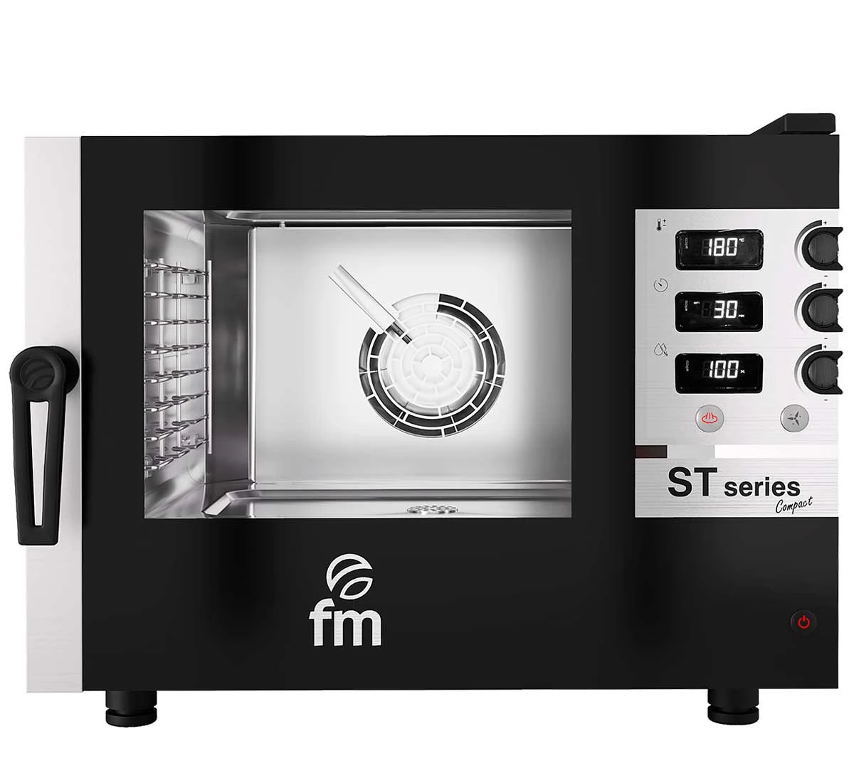 El Horno Mixto Eléctrico STC 411 EW de FM dispone de mando analógico muy fácil de usar y la posición de la bandeja es transversal. Tiene capacidad para 4 bandejas GN 1/1.