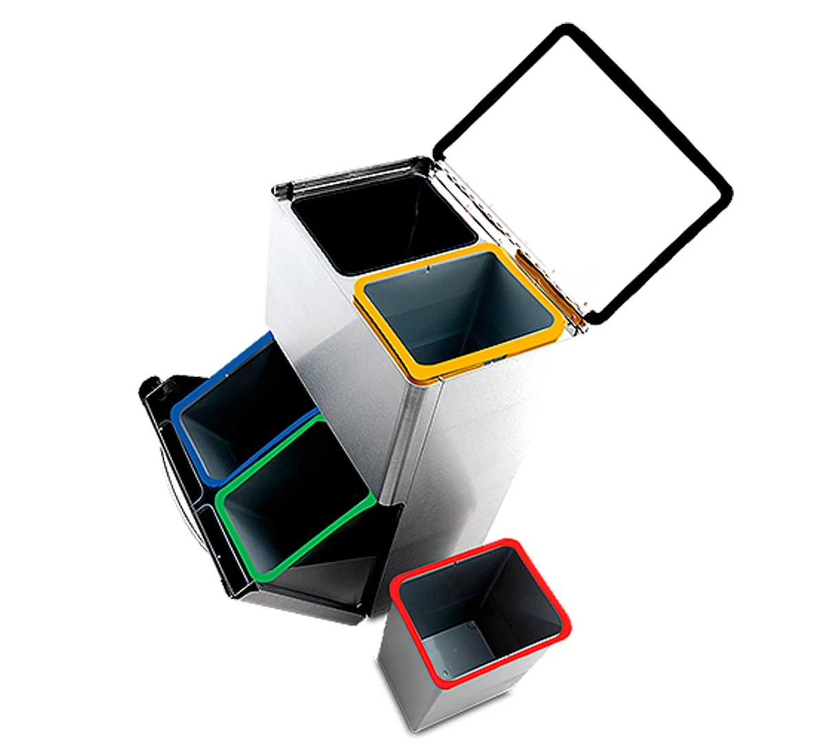 El Centro de reciclado de Fricosmos tiene cuatro compartimentos y está fabricado en acero inoxidable.