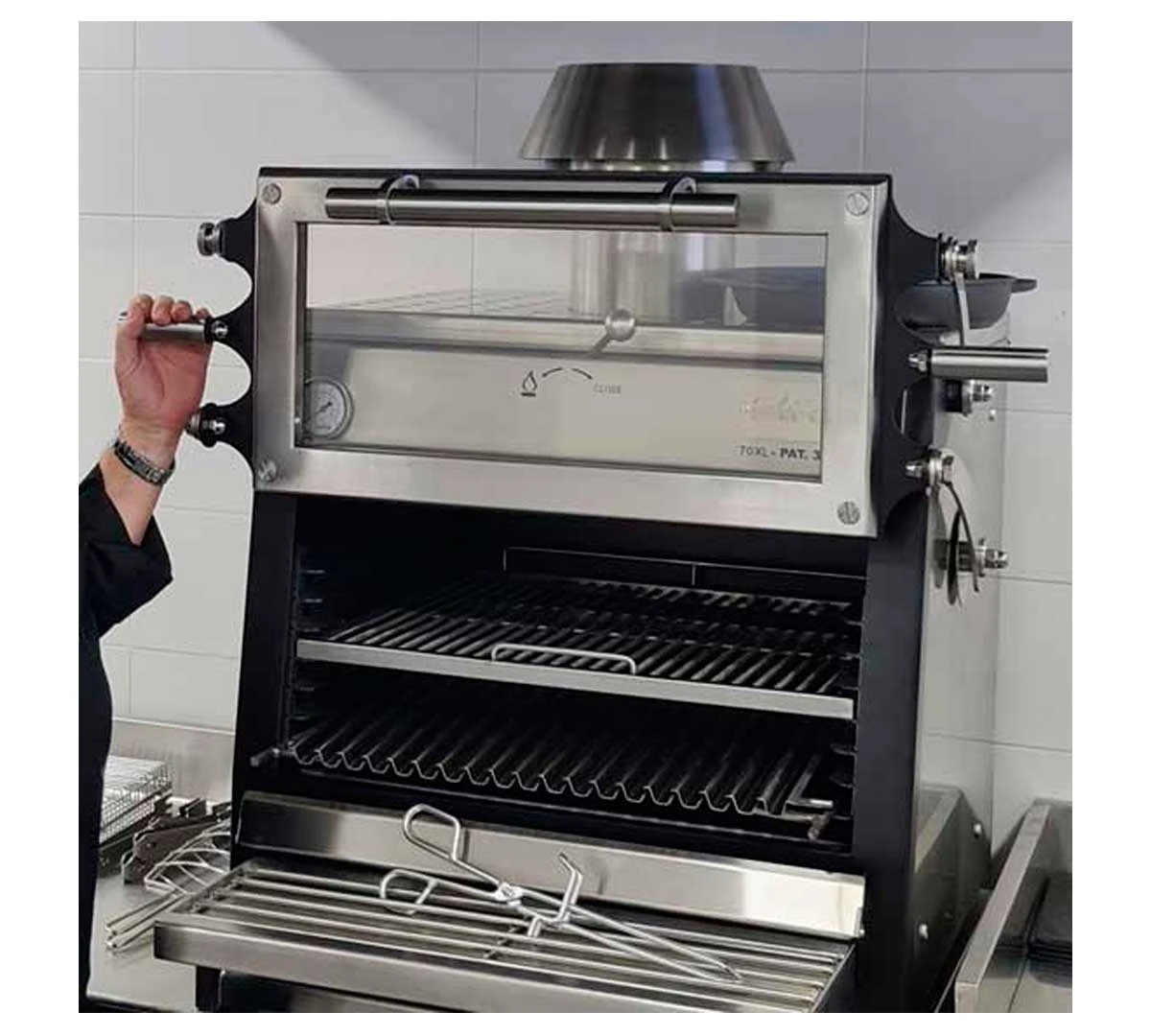 La puerta de cristal panorámica le permite ver los productos que se cocinan, no tiene que mantener la puerta abierta para ver el alimento. Mantiene la temperatura del horno siempre más constante y reduce el consumo de carbón. La versión de puerta elevable reduce el espacio entre el chef y el horno.