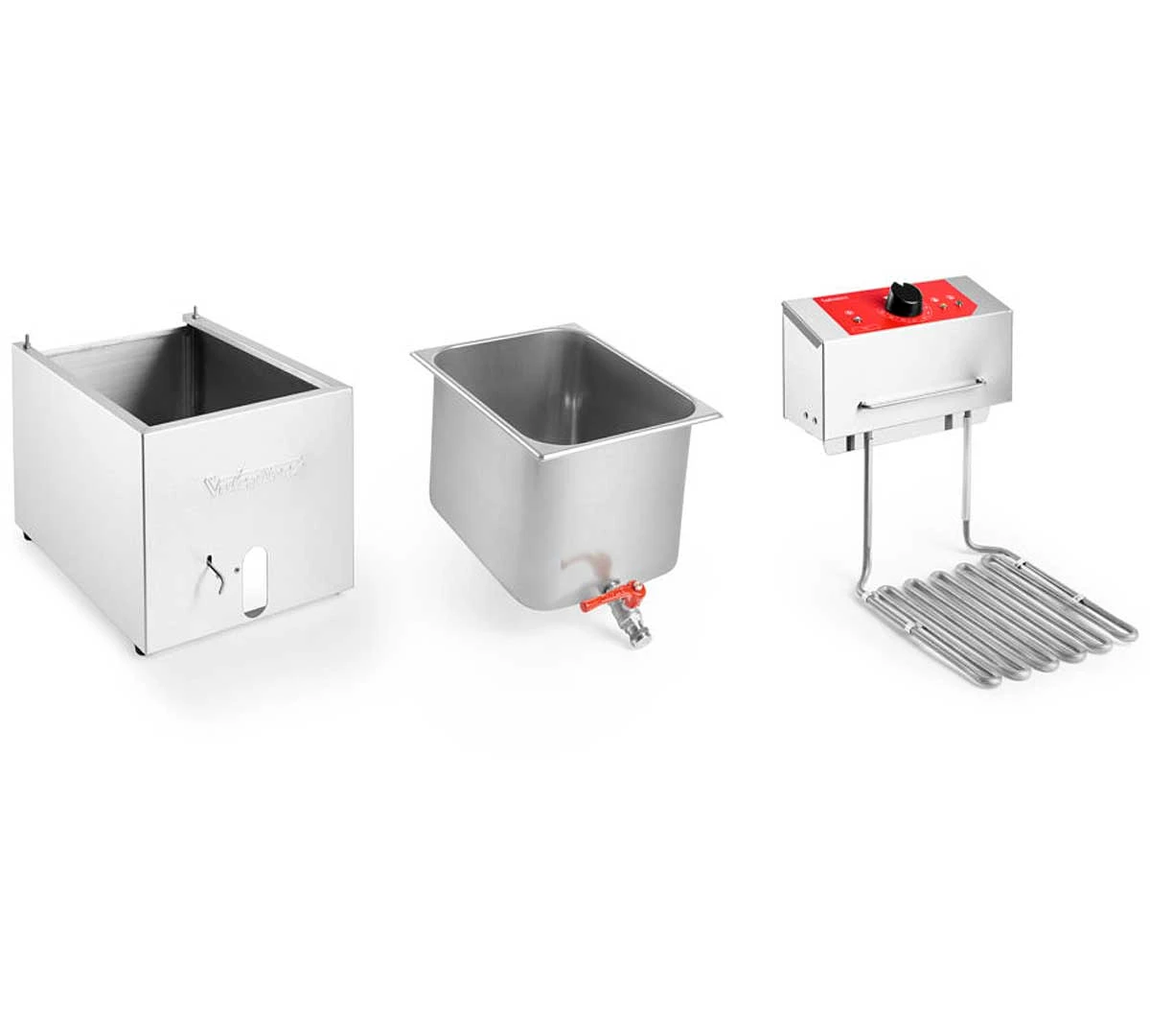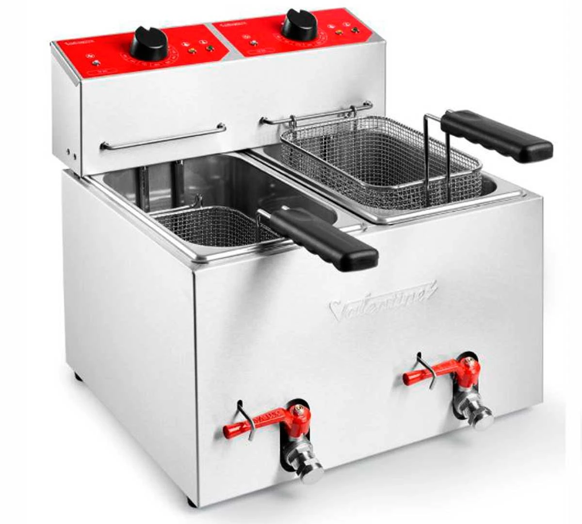La Freidora TF-55 de Valentine está fabricada en acero inoxidable y equipada con grifo de vaciado.